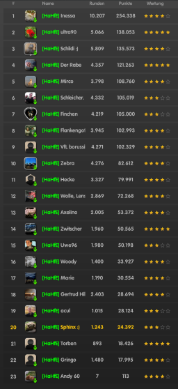 | 17 | 3 | Schildi :) | Ulrike | 5.809 | 135.573 | 23,338 |
