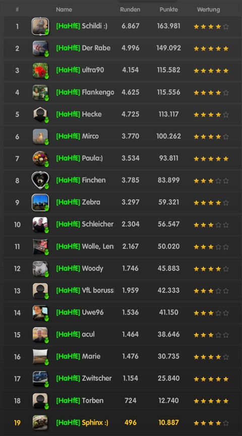 | 11 | 1 | Schildi :) | Ulrike | 6.867 | 163.981 | 23,880 |
