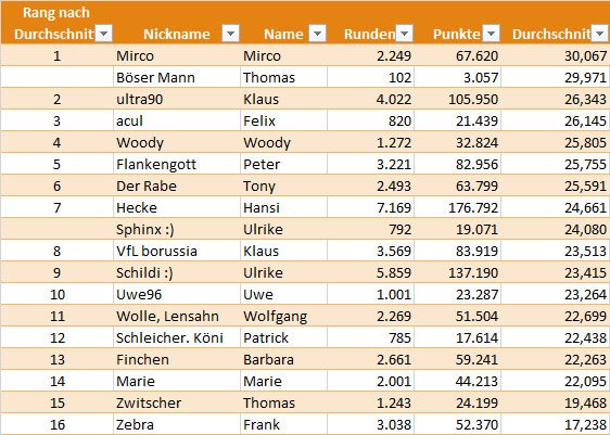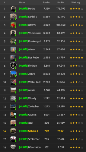 In der Mitglieder-Rangliste sieht man immer wieder die "üblichen Verdächtigen" in den oberen Rängen. Das sind diejenigen, die neben Glück und Können auch noch mehr Zeit haben als andere von uns.