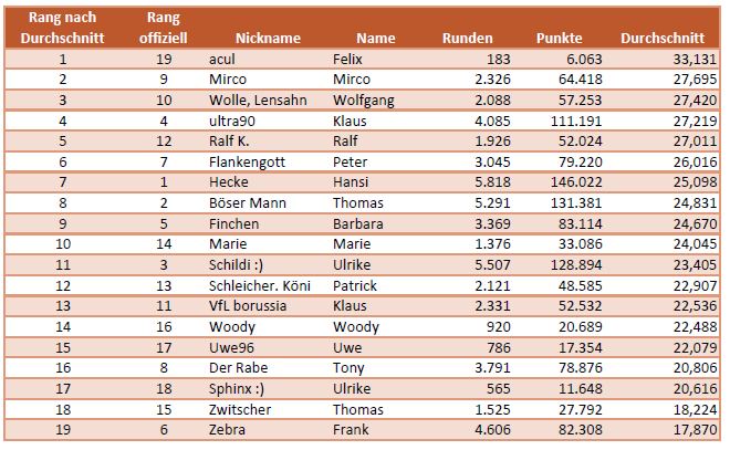 Hier fällt auf, dass Felix wenig Gelegenheit hatte, Skat zu spielen. Das tut seiner Leistung aber keinen Abbruch. Das gilt für alle: Niemand von uns ruht sich auf irgendwelchen Ergebnissen aus. Jede/r spielt dann, wenn er / sie Gelegenheit dazu hat.