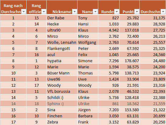 In der Mitglieder-Rangliste sieht man immer wieder die "üblichen Verdächtigen" in den oberen Rängen. Das sind diejenigen, die neben Glück und Können auch noch mehr Zeit haben als andere von uns.