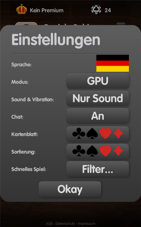 Du kannst das Kartenblatt auswählen, z. B. auch deutsches Blatt (einiges nur mit Premium) und die dir sympathischste Sortierung auf der Hand.