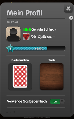 Mit den erzielten Erfahrungsstufen werden Kartenrücken und Tischfarben freigeschaltet. Aus den freigeschalteten Designs kannst du hier auswählen. Wenn du Abwechslung liebst, aktivierst du "Verwende Gastgeber-Tisch".