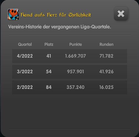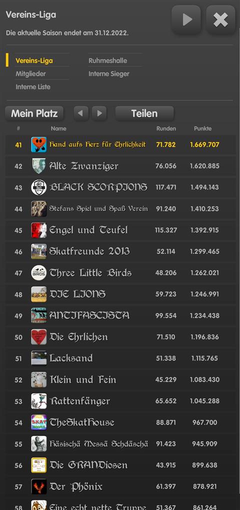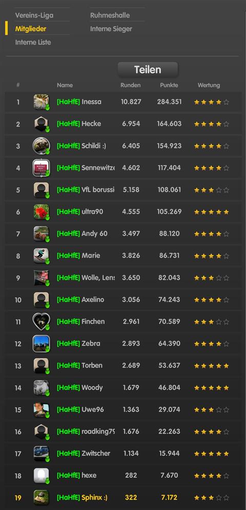Wie gut wir sind, siehst du in der Vereins-Liga daran, wie viel mehr Spiele andere Vereine brauchen, um an uns heranzureichen oder uns zu übertreffen.