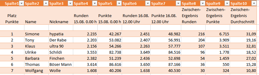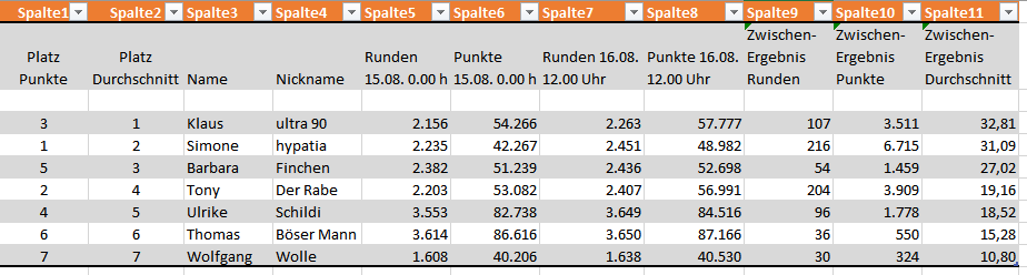 Hier seht Ihr die Zwischenstände zum "Bergfest des Bergfestes":