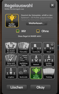 In den Einstellungen kannst du auch dann eine Sonderregel auswählen, wenn du nicht die Premium-Option gebucht hast. Mit Premium-Option kannst du diverse Regeln - ganz nach deinem Geschmack - auswählen. Allerdings dauert die Suche nach einem schnellen Spiel umso länger, je mehr Sonderwünsche vorgegeben sind.