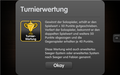 Die nach Turnierwertung erzielten Punkte werden auch komplett in den Ligen berücksichtigt. Deshalb ist es sinnvoll, möglichst immer mit Turnierwertung zu spielen.