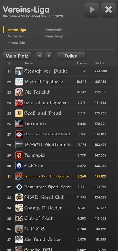 Das neue Jahr und das neue Quartal werden jetzt 5 Tage alt. Schon jetzt ist in den Ligen deutlich zu sehen, dass wir ein Super-Team sind. Das ist zwar nicht in Stein gemeißelt, aber heute (5.Januar 2023) sind wir auf Platz 31.