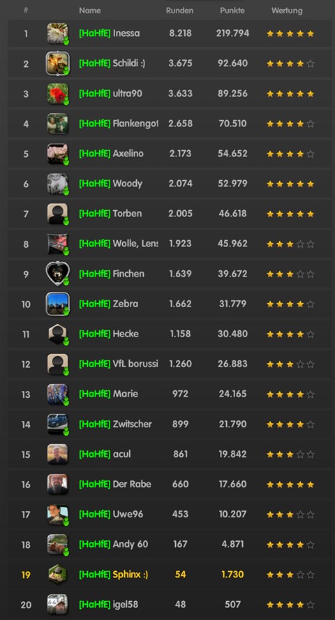 | Rang nach Durchschnitt | Rang offiziell | Nickname | Name | Runden | Punkte | Durchschnitt Punkte/Runde | Tage | Runden/ Tag | Punkte/ Tag |