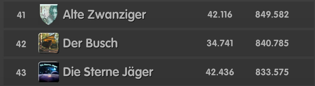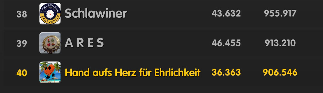 | 19 | 20 | igel58 | Norbert | 48 | 507 | 10,563 | 11 | 4,36 | 46,09 |